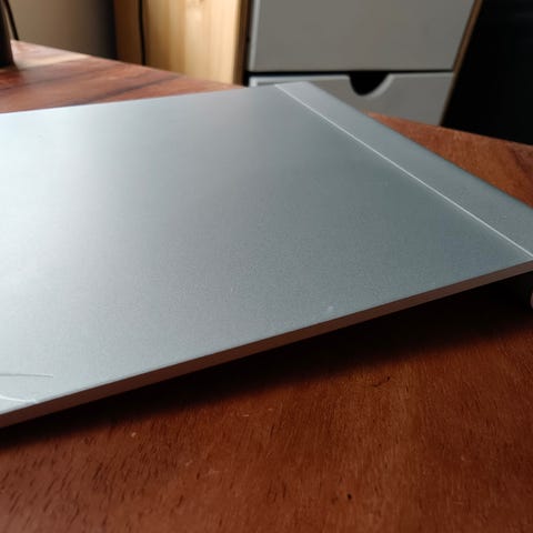 Apple Magic Trackpad kosketuslevy. Väri vaalea harmaa/alumiini. Sopii käytettäväksi Mac-tietokoneiden kanssa hiiren korvaajana tai sen rinnalla. Kosketuslevy tukee monikosketuseleitä, kuten vieritystä, pyyhkäisyjä ja zoomausta. Laite toimii langattomasti Bluetooth-yhteydellä ja käyttää paristoja. Runko on alumiinia ja yläpinta lasia, pohjassa kumijalat pöytää vasten.