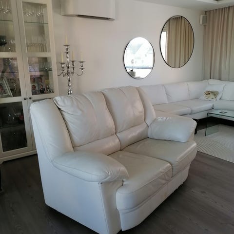 Annetaan nahkasohva. Kulumaa nahkassa on.