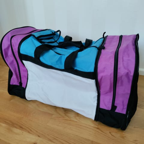 Kangaslaukku unisex-käyttöön. Laukku on valmistettu kankaasta ja siinä on useita vetoketjullisia taskuja sivuilla ja edessä. Pääosasto avautuu vetoketjulla ja tarjoaa tilavan säilytystilan esimerkiksi urheilu- tai matkakäyttöön. Laukussa on kantokahvat. Väritys on kaksisävyinen, tummapohjainen kangas kontrastivärisillä yksityiskohdilla ja painatuksilla etupuolella.