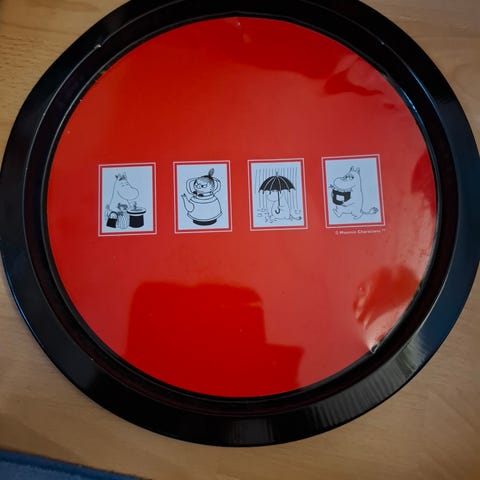 Peltinen muumitarjotin. 4 kuvaa. Punamusta.
