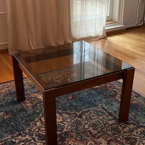 Vintage teak sohvapöytä savulasikannella. Erittäin hyvässä kunnossa.