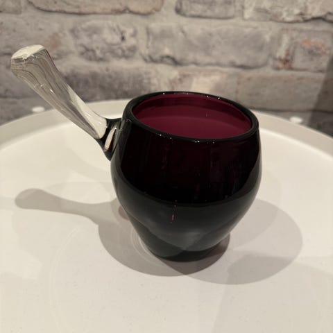 Sarvituoppi, lila, Kumela Oy. Sirkku Kumela-Lehtosen suunnittelema lila sarvituoppi, kahva kirkasta lasia. Sarvituoppeja valmistettu eri väreissä 1960-1976 välisenä aikana, ovat kenties tunnetuimpia Sirkun suunnittelemia lasiesineitä.