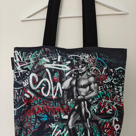 Tom of Finland esiliina mustavalkoisella kuosilla. Esiliinassa on säädettävä niskalenkki ja taakse solmittavat nauhat. Edessä on musta etutasku, jossa vetoketju. Sopii käytettäväksi keittiössä tai muussa suojavaatetusta vaativassa kotityössä.