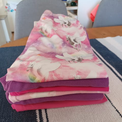 Leggingsit 140 cm. Merkkeinä Peuhu, H&M, Shein, House ja Glup.