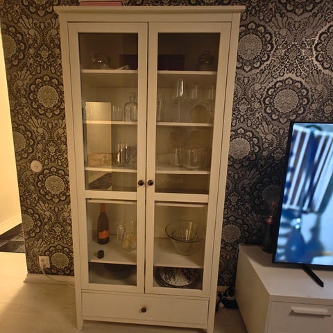 Valkoinen vitriinikaappi, jossa on kolme lasiovea ja useita hyllytasoja säilytykseen ja esillepanoon. Ostaja noutaa. Käteinen tai Mobilepay.