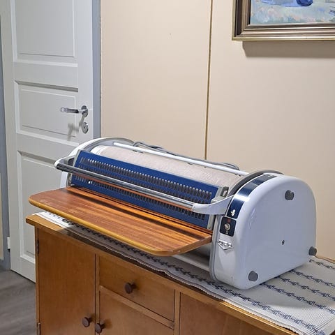 Rosenlew pyykkimankeli. Vapaasti lattialla seisova malli, jossa on keltainen runko ja mankelointirulla. Laitteessa on metallirunko ja alahylly esimerkiksi pyykkien tai tarvikkeiden säilytykseen. Soveltuu kodin pyykin mankelointiin ja sileyttämiseen.