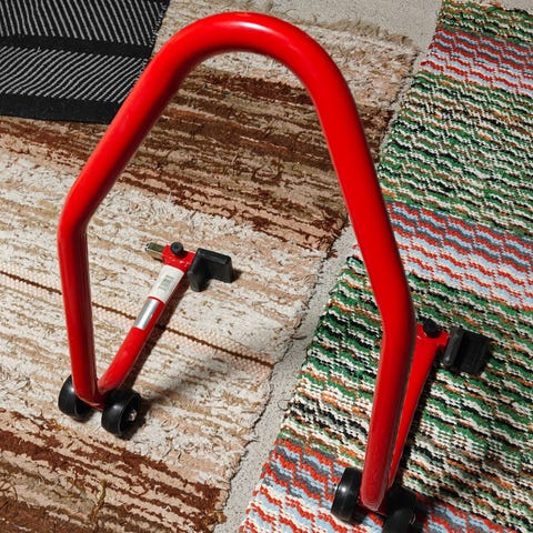 Moottoripyörän takateline. Väriltään punainen, metallirunkoinen teline, jossa on pyörät siirtämistä varten. Telineessä on säädettävät koukkukiinnikkeet takahaarukalle. Soveltuu moottoripyörän takapään nostamiseen ja tukemiseen esimerkiksi huoltoa, renkaanvaihtoa tai säilytystä varten.
