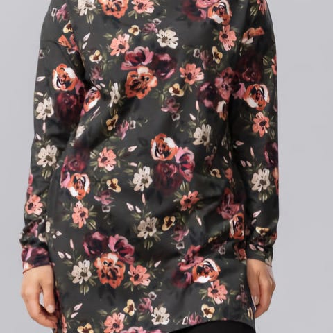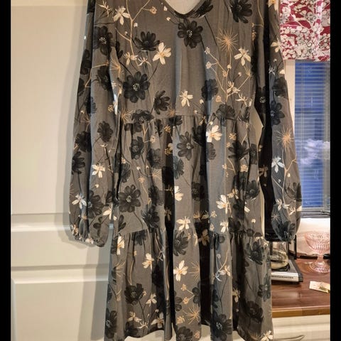 Erittäin vähän käytetty, pehmeä Versonpuoti collegetunika sivutaskuilla. Mustanharmaa kukkakuosi. Koko M.