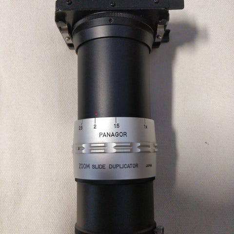 Panagor Zoom Slide Duplicator. Kuin uusi. Vaatii erillisen kameramerkkikohtaisen sovittimen, jolla voidaan yhdistää kamerarunkoon.