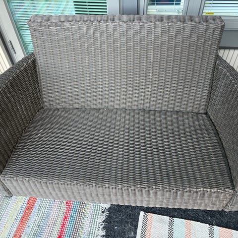 Polyrottinkinen ulkosohva vaaleilla istuin- ja selkätyynyillä. Sohvassa on punottu runko ja metallijalat. Sopii parvekkeelle, terassille tai muuhun ulkotilaan. Väri on vaalea, neutraali sävy, joka on helppo yhdistää erilaisiin ulkokalusteisiin ja tekstiileihin.