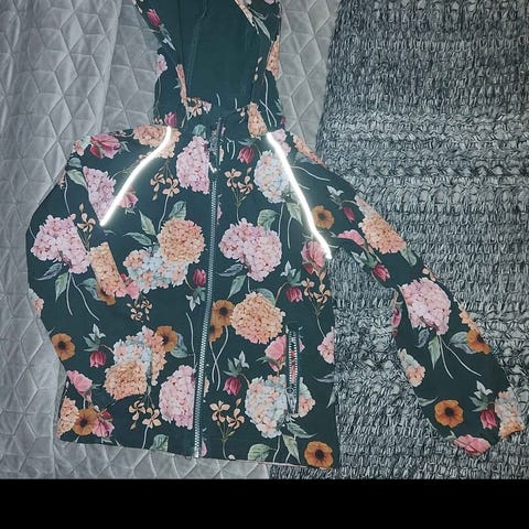 Takki on täysin ehjä ja pitää kevyttä sadetta. Sopii kevääseen ja kylmempiin kesäpäiviin.