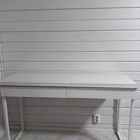 Myydään työpöytä. Valkoinen korkeakiilto ja lasikansi. Ostettu käytettynä, mahdollisesti Kruunukalusteesta alunperin. Kohtalainen kunto, jonkin verran natisee, ei ole kokeiltu mistään kiristää. Yhdessä lipastossa takaosasta pinta haljennut kuvan mukaisesti. Parissa lipastossa pientä löysyyttä. Kuvissa kuvattuna pientä pintavirhettä. Lasi kauttaaltaan ehjä.
