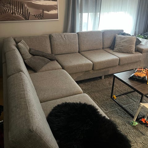 Pidempi divaaniosa n. 200 cm ja lyhyempi n. 145 cm. Sohvan leveys n. 3 metriä.