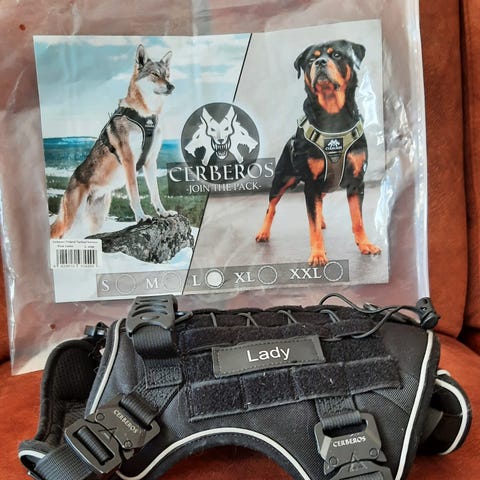 Gerberos Tactical-valjaat, koko S. Tästä vähän ronskimmat valjaat koiralle. Valjaissa molle-kujat ja velcro-tarroille kiinnistyspaikat.
