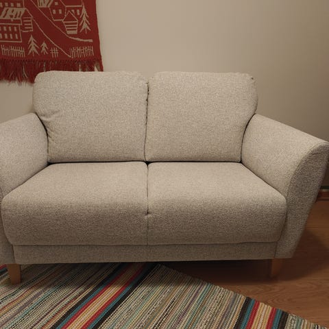 Suomalainen kolmen istuttava sohva, jossa turkoosi kangasverhoilu. Suorat linjat ja matala selkänoja. Kiinteä istuinosa ja irrotettavat selkätyynyt, Max 180 cm mahtuu hyvin myös nukkuman Sopii olohuoneeseen tai oleskelutilaan useamman henkilön istumapaikaksi.