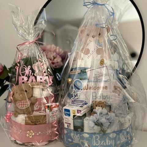 Kakkuun tulee noin 30 vaippaa ja koristeena on joko vaaleanpunaista tai vaaleansinistä nauhaa. 🩵🩷