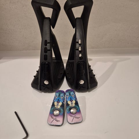 Freejump jalustimet, joissa leveä jalkalaatta ja joustava ulkopuoli. Vähentävät vaaraa tarttua jalustimeen satulasta suistuttaessa. Sopivat kengänkokoon 39.