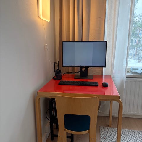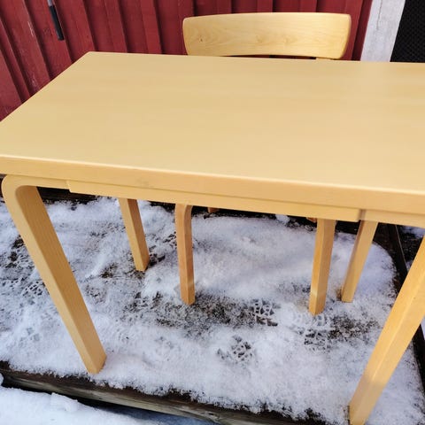Ok-kuntoinen, lähemmällä tarkastelulle huomaa ajankulua ja lasten jälkiä, mutta edelleen käyttökelpoinen työpöytänå ollut 81b -pöytä uuteen kotiin ja käyttöön. 120x75, korkeus 72.