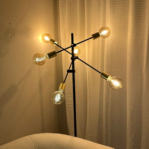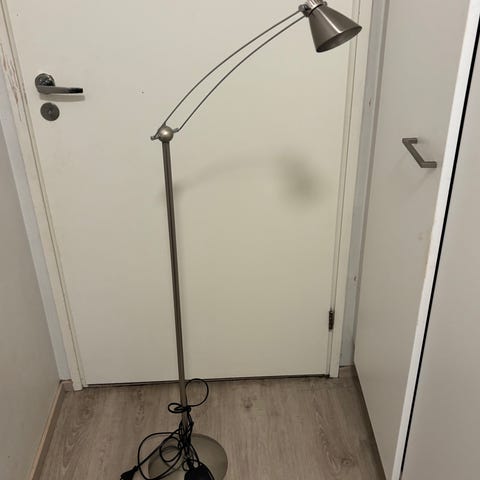 Myydään tarpeettomaksi jäänyt lattiavalaisin lukuvalolla. Molemmat valot ovat himmennettäviä. Väri hopea/harjattu teräs. Korkeus 180cm.