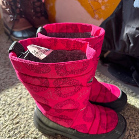 Mustat Kuoma Lumi talvikengät. Koko 32, sisämitta 21,8cm . Näissä näkyy vähän käytön jälkiä, sisävuori painunut ja hieman kulunut kantapäiden takaa. Yleisilme kuitenkin siisti. Tuli meille käytettynä, muttei päätynyt käyttöön, koska oli kuitenkin väärä koko.