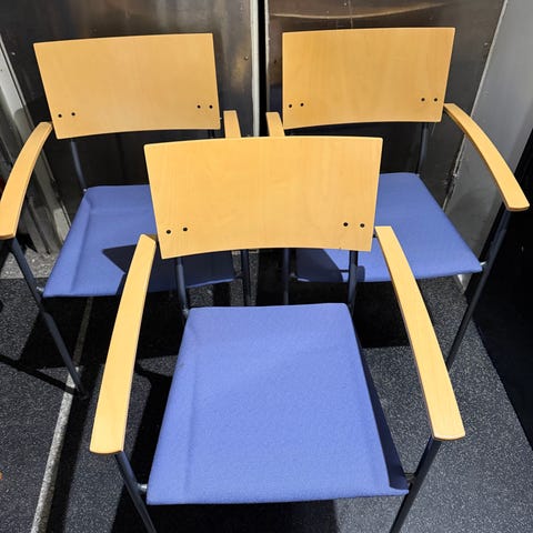 Tuoli, jossa on metallijalat, musta kangasverhoiltu istuin ja kaareva puinen selkänoja. Tuolit ovat pinottavia, mikä helpottaa säilytystä ja siirtelyä. Soveltuu esimerkiksi ruokapöydän tuoliksi, työtuoliksi tai lisätuoliksi olohuoneeseen, toimistoon tai neuvottelutilaan. Siistikuntoisia.