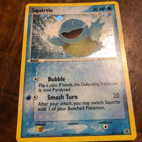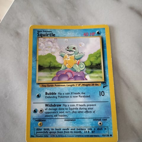 Pokémon Squirtle keräilykortti. Kortissa on Squirtle-hahmo ja taustalla hopeansävyinen kuviointi. Kääntöpuolella on Squirtlen kuva sekä tietoja hahmosta. Soveltuu Pokémon-keräilyyn tai kokoelman täydentämiseen.