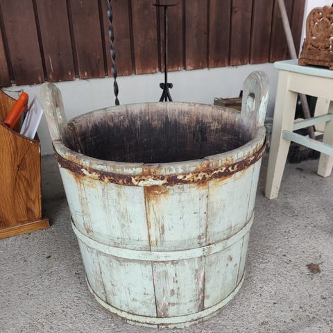 Puinen saavi, jossa molemmilla puolilla kiinteät kahvat. Ulkopinta on puuta ja vahvistettu metallivanteilla. Sisäpinta on vaalea ja kulunut, pohjalla näkyy käytön jälkiä. Sopii esimerkiksi säilytysastiaksi tai koristeelliseksi sisustuselementiksi.