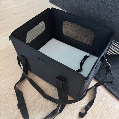 Muovinen lemmikkikuljetuslaatikko pienille eläimille. Väri on harmaa, ja laatikossa on vaaleanpunaisia yksityiskohtia kiinnikkeissä ja kahvassa. Sivuseinissä on useita ilmanvaihtoaukkoja. Laatikko soveltuu esimerkiksi kissan tai pienen koiran kuljettamiseen autossa tai lyhyillä matkoilla.