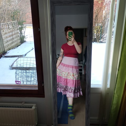 Vaaleanpunainen vintagehame XS, keltainen S (menee myös pieni M).