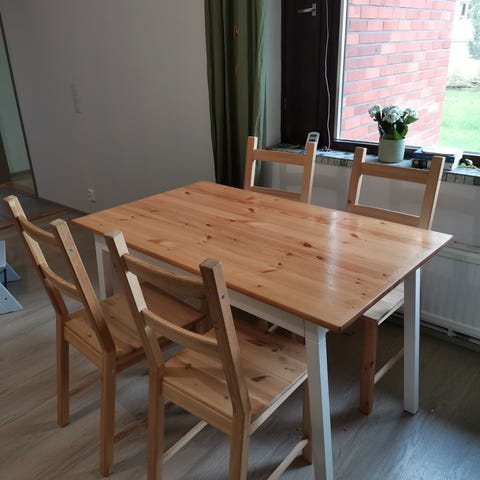 Myydään käytetyt ikean vihals pöytä ja 2kpl skålsta tuolia! Tuoleihin ja pöytään on tullut naarmuja/kulumaa käytössä ja pöydän yhdestä kulmasta päällinen vähän noussut. Pöydän ja tuolit voi ostaa yhdessä tai erikseen!😊
