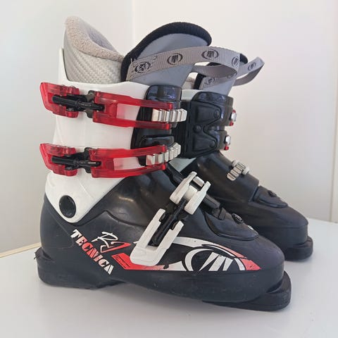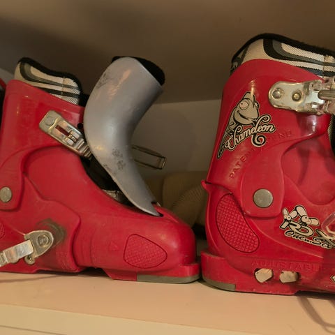 Vaaleat, taka kiristeiset laskettelumonot, joissa yksi leveä kiristyshihna kantapään takana. Pehmustettu sisävuori ja muovinen kuori. Pituus pohjasta mitattuna noin 30 cm (kuvassa mitta viitteellinen). Sopivat lasketteluun rinteissä. Kulumajälkiä kuoren pinnassa, näkyy kuvissa.