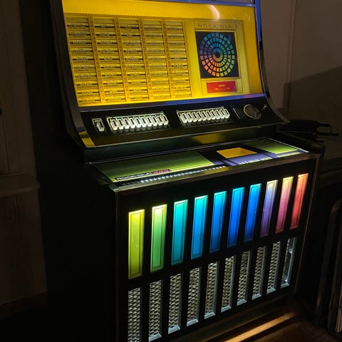 Myydään NSM Sapphire lattiamallinen Jukebox. Sis. 100 levyä.