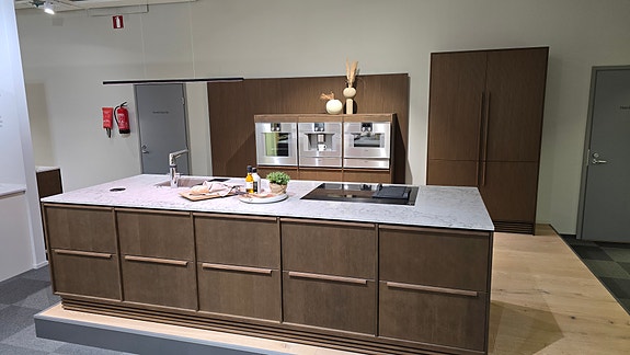 Tyylikäs valkoinen Novart mallikeittiö Tampereen Kalen myymälässä. Komeroseinän leveys 3210mm ja niemeke 2835mm x 1200mm. Korkealuokkaiset Miele höyryuuni, uuni, vakumointilaatikko, induktiotasotuuletin, integroidut jääkaappi ja pakastin sekä astianpesukone. Ylämaan Graniitin valmistama kvartsitaso Dekton Helena. Stalan allas ja Oraksen hana kuuluvat hintaan.