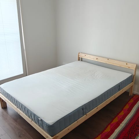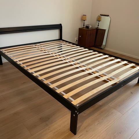 Mukaan tulee säleiköt, ja lisäksi mukaan saa halutessaan patjan (sekin Ikean). Huomioithan kuitenkin, että patja EI missään nimessä ole uudenveroinen. Siinä on irroitettava päällinen, mikä mahdollistaa pesun.
