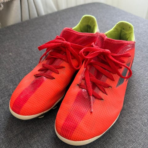 Adidas jalkapallokengät nappulapohjalla. Monivärinen pinta, jossa harmaan, keltaisen ja punaisen sävyjä. Nauhakiinnitys ja tekstiilipäällinen. Pohjassa muoviset nappulat luonnonnurmelle tai keinonurmelle. Sisävuori tekstiiliä. Yhdessä kuvassa näkyy kulumaa kantapään sisäosassa. Soveltuvat jalkapallon pelaamiseen ulkokentillä.
