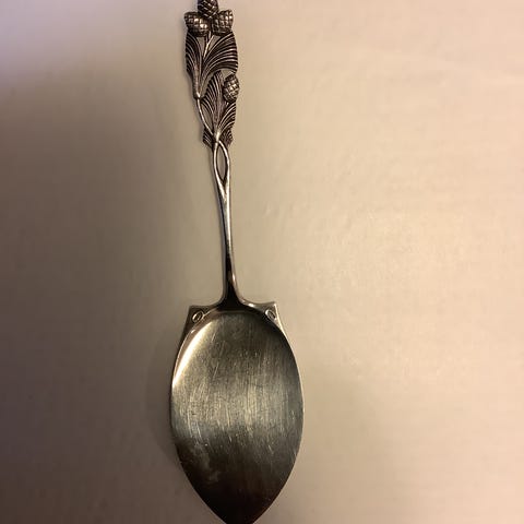 Kuvanmukainen vanha kakkulapio. Kaiverrukset näkyvät kuvissa.