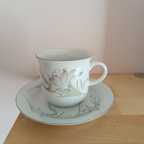 Hieno lasinen astiasto juhliin. 24kpl. Sisältää kupit ja aluslautaset sekä kakkulautaset... Löytyy myös viimeisen kuvan lautasia mukaan, esim salaattia varten...
