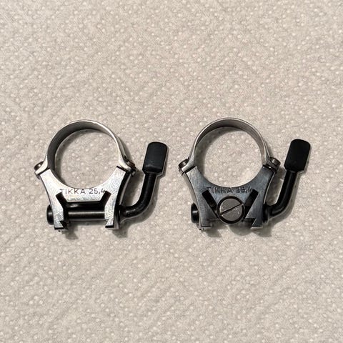 Hyväkuntoiset yksiosaiset Optilockit (Tikan) 17mm kiskoon tuumaiselle kiikarin runkoputkelle. Laadukkaat jalat. Korkeus medium.