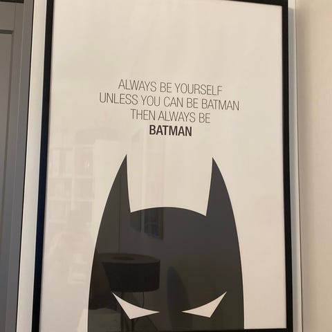 Kehystetty juliste, jossa mustavalkoinen Batman-aiheinen grafiikka ja teksti "Always be yourself unless you can be Batman then always be Batman". Juliste sopii sisustuselementiksi esimerkiksi olohuoneeseen, työhuoneeseen tai lastenhuoneeseen. Mustavalkoinen väritys tekee julisteesta helposti yhdisteltävän erilaisten sisustustyylien kanssa.
