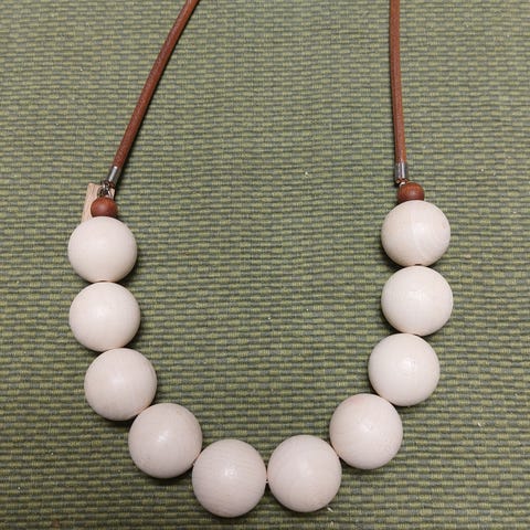 Keskellä yksi iso luonnonvalkoinen puuhelmi halkaisija 3,3 cm. Luonnonkuituauhassa metallirenkaita ja puuhelmiä.