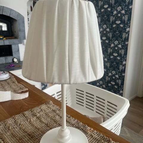 IKEA-pöytävalaisin, jossa on lieriönmuotoinen valkoinen kangasvarjostin ja musta metallijalusta. Johdossa on päälle/pois-kytkin. Ihanteellinen yöpöydälle, sivupöydälle tai työpöydälle, yleisvalaistukseen tai viihtyisän tunnelman luomiseen sisätiloihin. Käyttää vaihdettavaa polttimoa. Kaksi sivupöytää kahdella lampulla myydään hintaan 20 euroa.