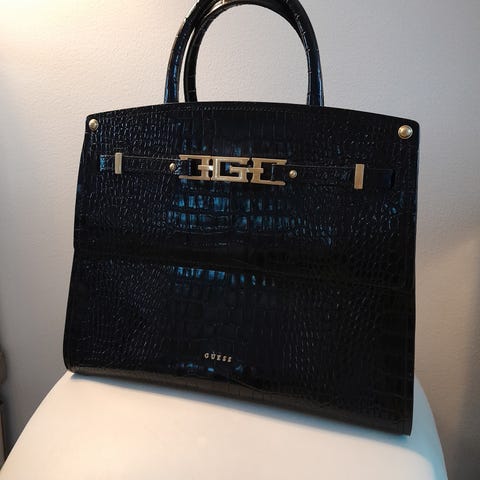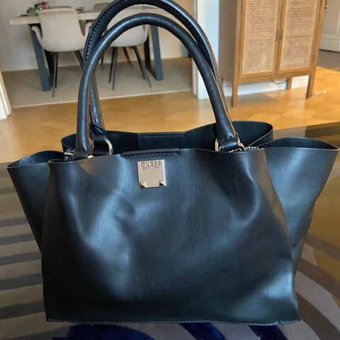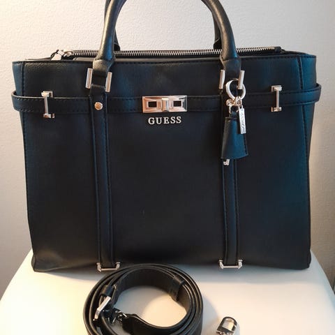 Väri on musta ja laukussa on kullanväriset metalliyksityiskohdat sekä Guess-logo etupuolella. Laukussa on kaksiosaiset pitkät kantohihnat olalla tai kädessä kantamiseen. Mukana Guess-säilytyspussi.