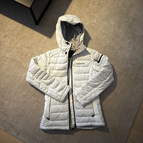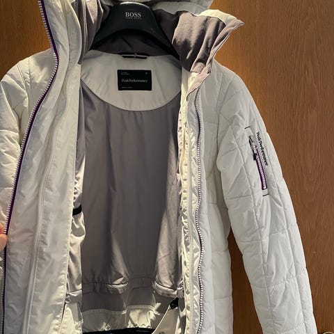 Peak Performance naisten kevättakki koossa M. Vuorelline .Väri on luonnonvalkoinen. Takissa on huppu ja vetoketjukiinnitys edessä. Edessä on taskuja, ja takki on sopii hyvin välikausikäyttöön. Malli on rento ja pituudeltaan lantiolle ulottuva.