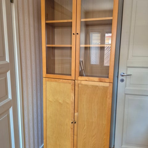 Vitriinikaappi, jossa kaksi lasiovea ja useita hyllytasoja. Materiaalina näyttää olevan lakattu tai käsittelemätön mänty. Kaappi soveltuu esimerkiksi astioiden, kirjojen tai koriste-esineiden säilytykseen ja esillepanoon. Kapea ja korkea malli, joka mahtuu pieneenkin tilaan, kuten käytävään tai pieneen huoneeseen.