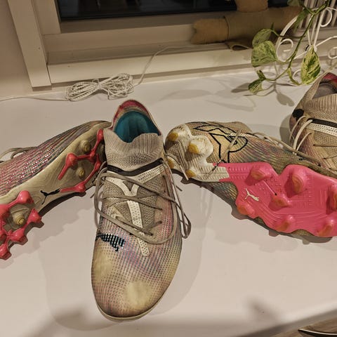Puma jalkapallokengät nappulapohjalla. Kengissä on musta pinta ja valkoiset Puma-logot. Pohjassa on useita kiinteitä nappuloita, jotka on tarkoitettu luonnonnurmelle tai keinonurmelle. Nauhakiinnitys auttaa säätämään istuvuutta. Soveltuvat jalkapallon pelaamiseen ulkokentillä.