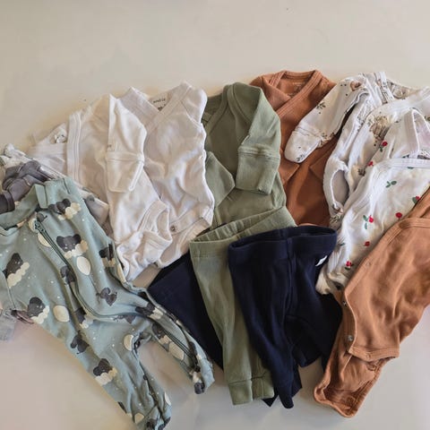 H&M vauvan vaatesetti, johon kuuluu useita vauvan bodyja ja housuja. Koko 44 (vastasyntynyt). Väri pääosin beige, mukana myös harmaan ja sinisen sävyjä. Materiaali puuvillaa. Unisex-malli, sopii sekä tytölle että pojalle. Bodyissa kietaisumalli ja pitkät hihat. Housuissa joustava vyötärö. Soveltuu vastasyntyneen arkipukeutumiseen ja kerrospukeutumiseen.