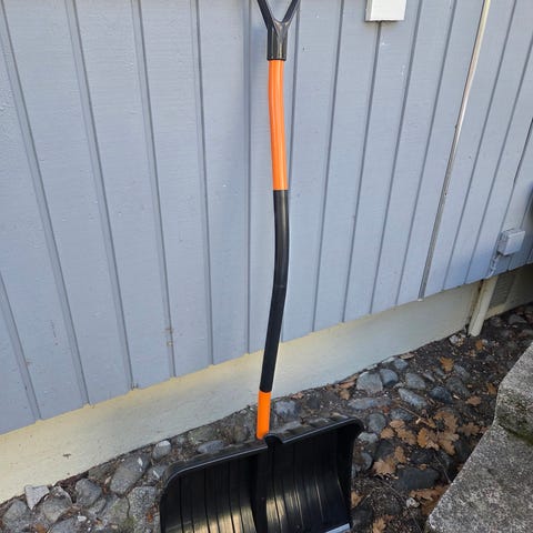 Lumiharja jonka toisessa päässä jääskrapa.