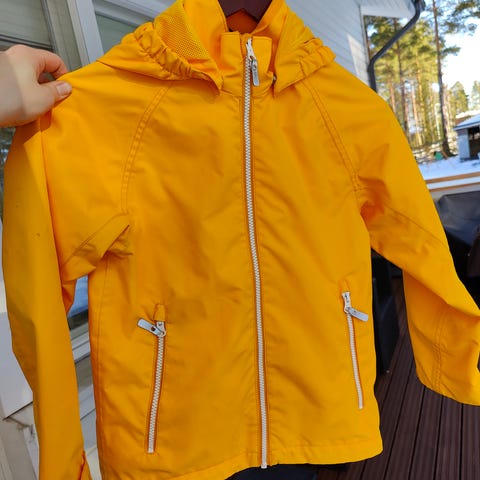 Keltainen polarn o pyret kuoritakki koko 134. Löytyy paljon tummentuma ja kuluma hihoissa ja muutama pieni tahra. Ehjä.