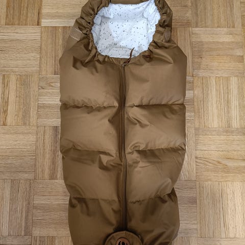 Tarralla aukeavat aukot turvakaukalon valjaille. Lämpöpussin saa avattua myös jalkopäästä kokonaan auki, niin isompi lapsi saa kengät pussin ulkopuolelle. (Meillä ei käytetty lainkaan kengät jalassa.)