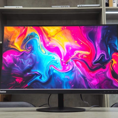 Lenovo 27" näyttö. Näytössä on säädettävä jalusta ja takana liitännät kaapeleille.